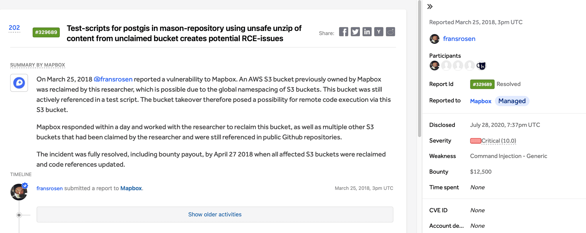 It could lead to an RCE via ZipSlip so Frans Rosen took over the S3 bucket and they rewarded him $12,500.