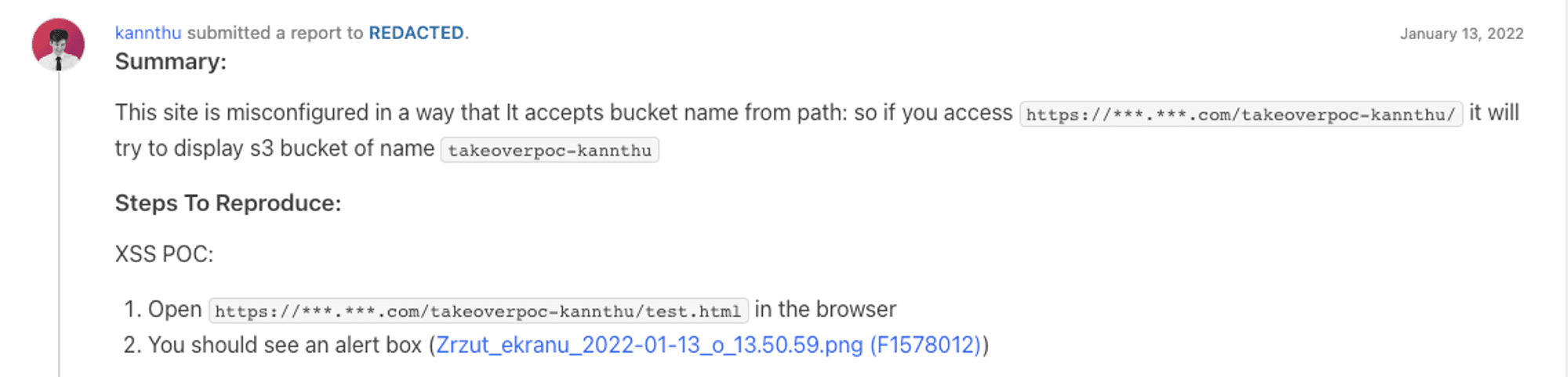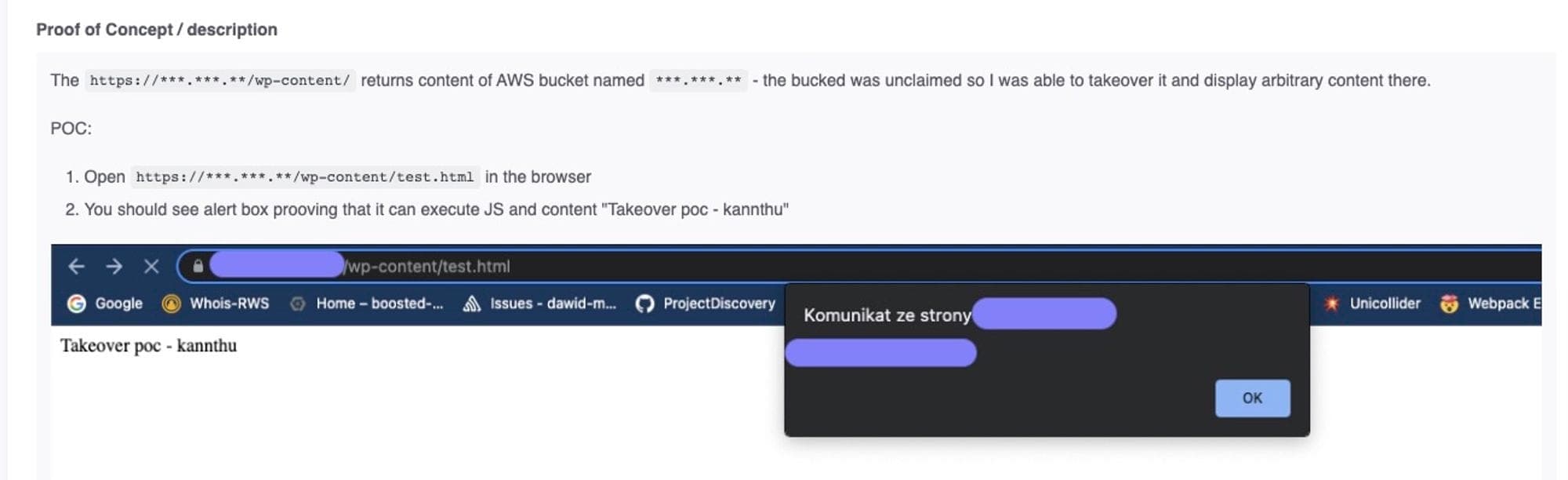 It allows hosting content from a company’s different S3 buckets under one domain. Or, to be precise, content from any bucket, including the XSS payload from our S3. It makes the attack even easier because you don’t even have to create a new bucket.